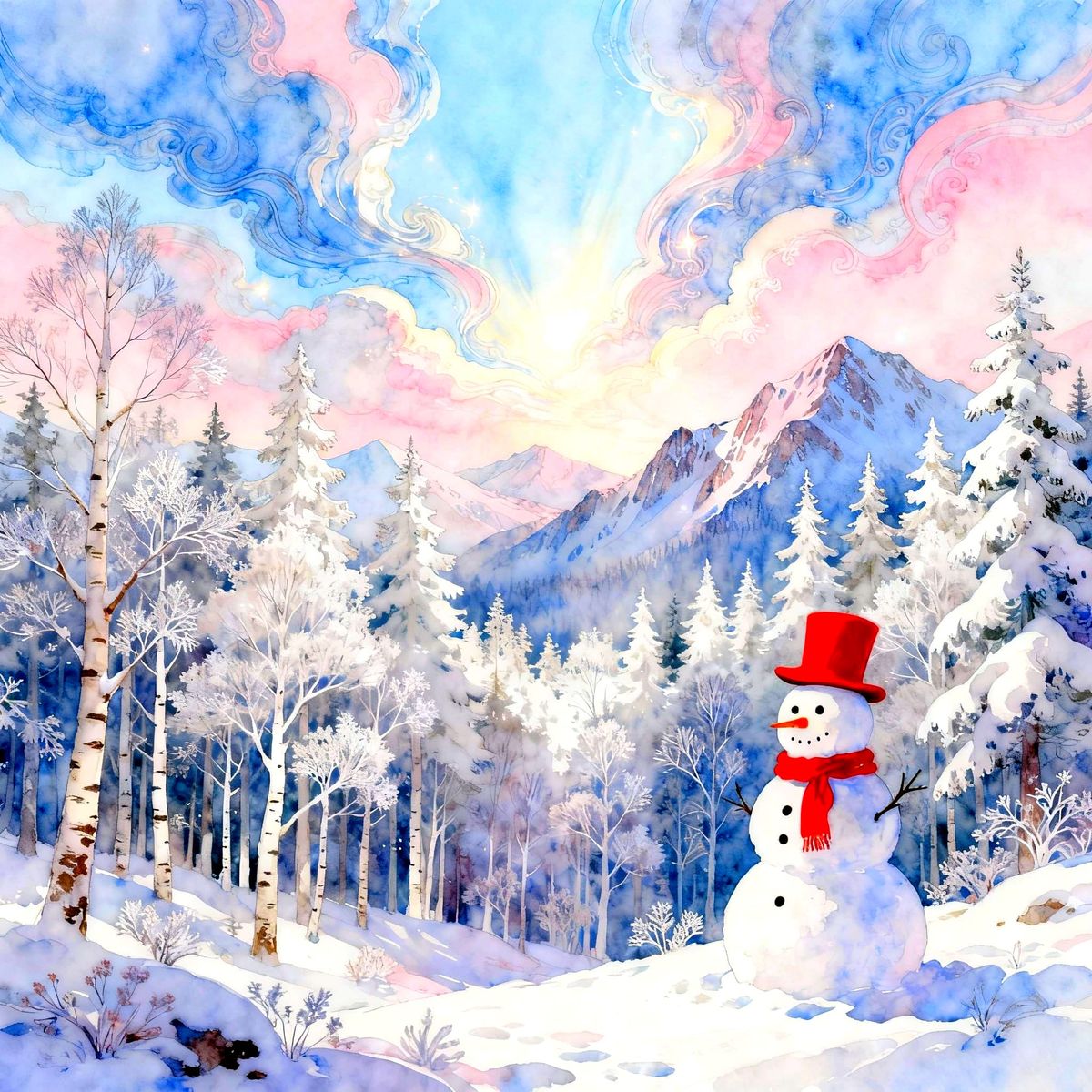 This image showcases a whimsical winter scene with a snowman, detailed forest, and mountains, rendered in a luminous watercolor storybook illustration style with soft, radiant lighting.