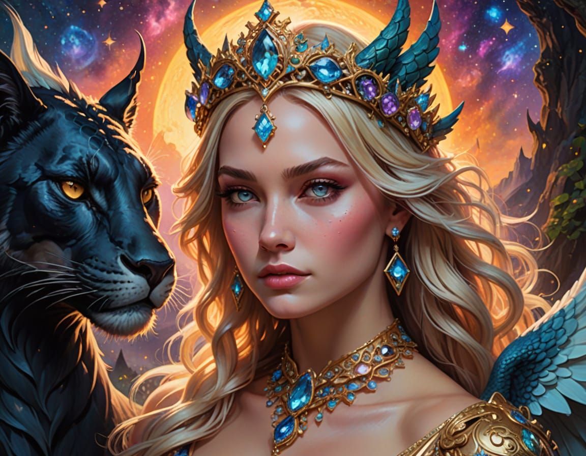 This image is a captivating portrait of a whimsical princess riding a unicorn through a vibrant, starry galaxy. The artwork is a stunning blend of realistic and abstract elements, featuring intricate details and a mesmerizing color palette.