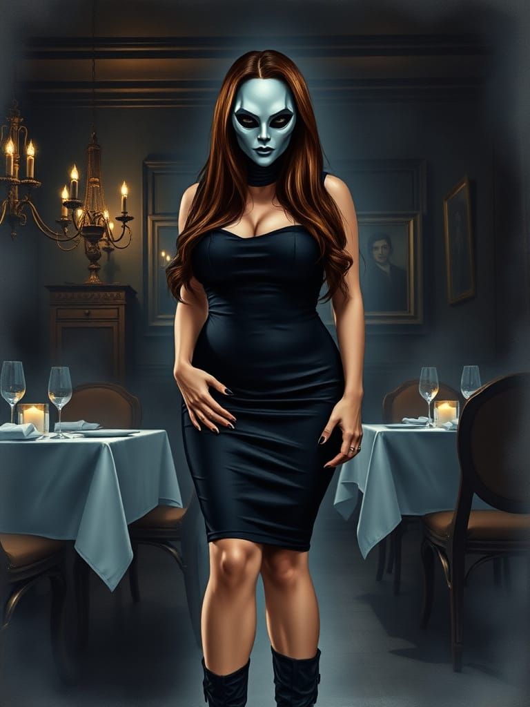 A surreal image of a woman with an alien-like aura in a dark restaurant. The gothic horror aesthetic features hyper-detailed textures and moody lighting, creating an enigmatic portrait.