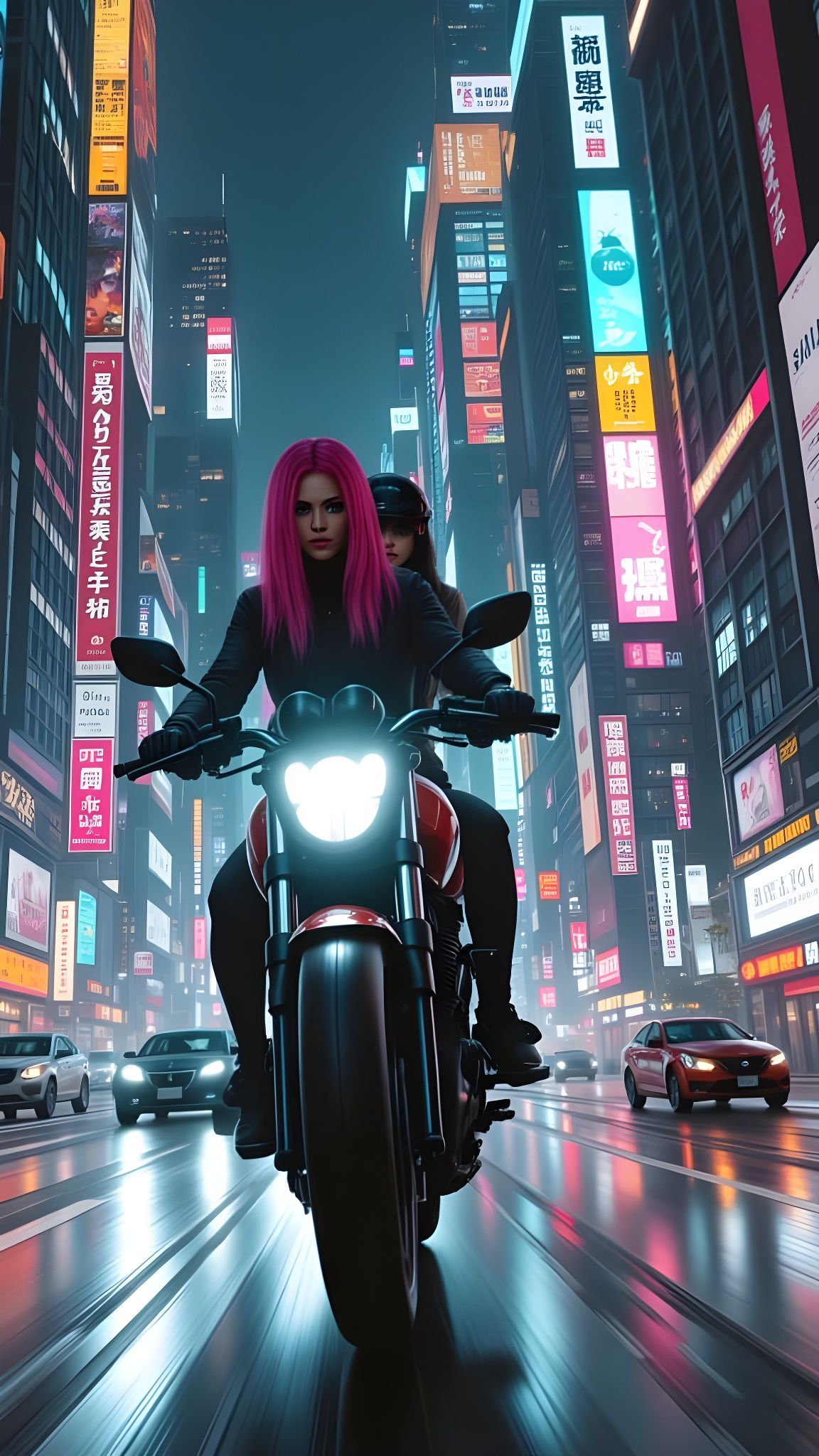 Two woman on a motorcycle, seen from behind the motorcycle, the pink hair of the rider on the back can be seen under her black helmet. Above, neon city signs and cityscape dwarf the bike a s other traffic, neon techno, futurism, detailed, motion <lora:Gridrunners NG:1.0> <lora:Collage Dream WC:1.0> <lora:Accu:1.0> ...