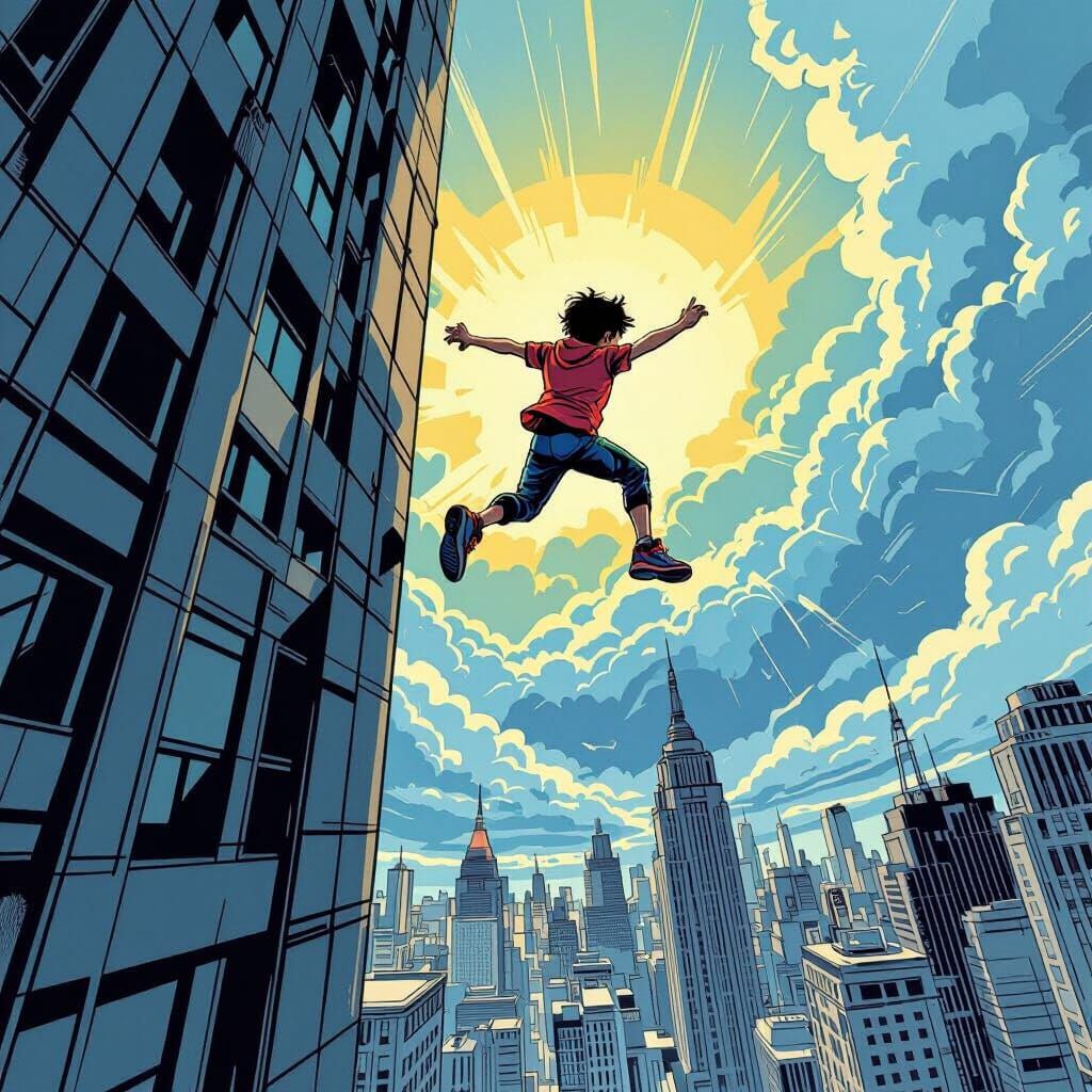A dynamic comic book style illustration of a boy mid-leap from a colossal building against a dramatic sky. Features bold lines, sharp shadows, and electric colors.