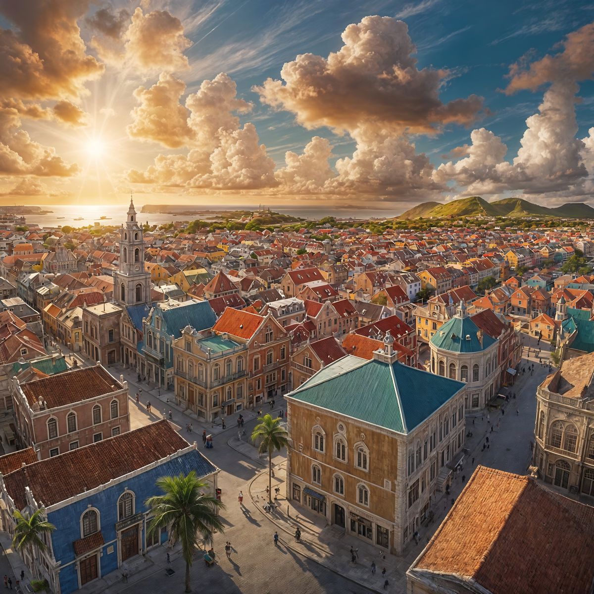 A breathtaking digital artwork of the historical centre of Willemstad, Curacao at sunset.