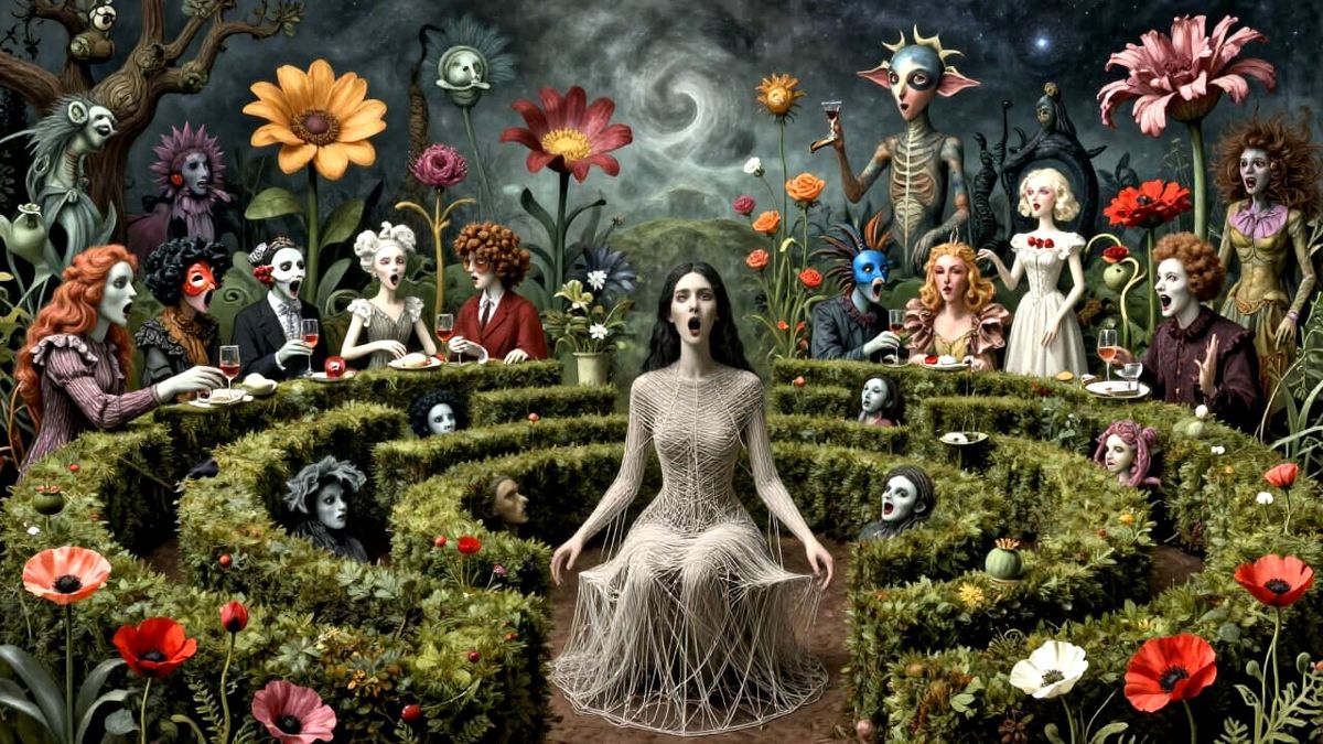 This image depicts a surreal garden party scene with a woman composed of strings, surrounded by poppies. It blends gothic horror and surrealism with a muted color palette.