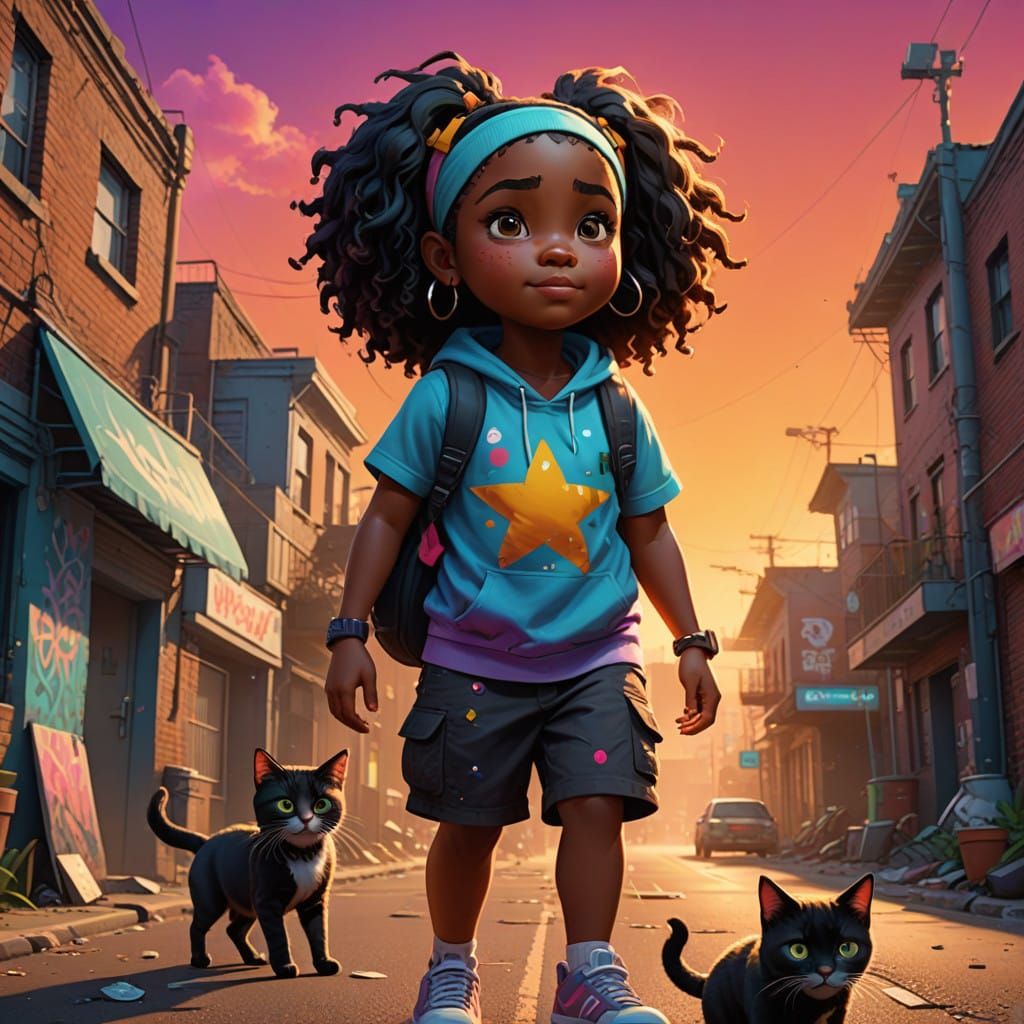 This colorful street art features a lively girl surrounded by playful kitties at the animal shelter, created with a mix of digital and traditional techniques, showcasing high contrast and bright colors in a cinematic style.