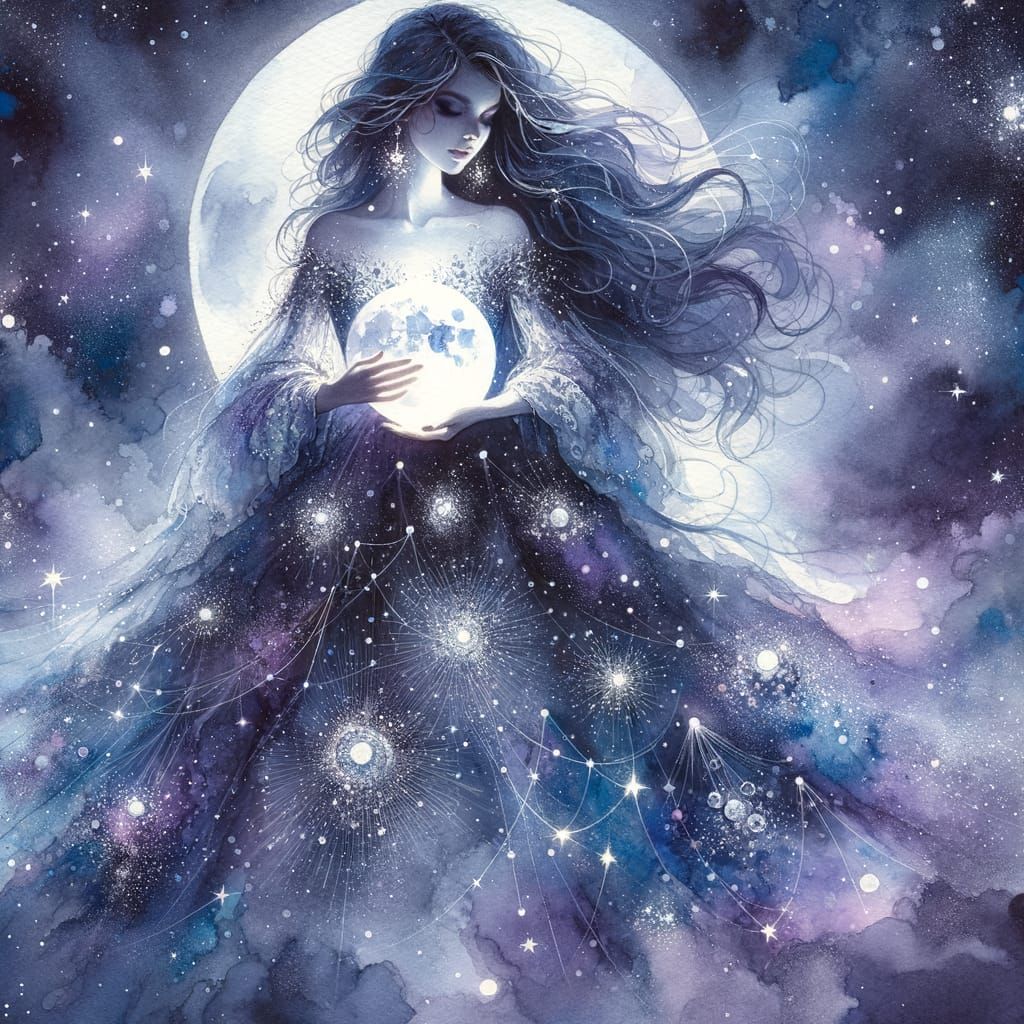 This elegant watercolor artwork depicts a fantasy princess holding a glowing moon under a vast, starry sky. Features celestial patterns, flowing stardust hair, and ethereal nebulae in deep blues and violets.