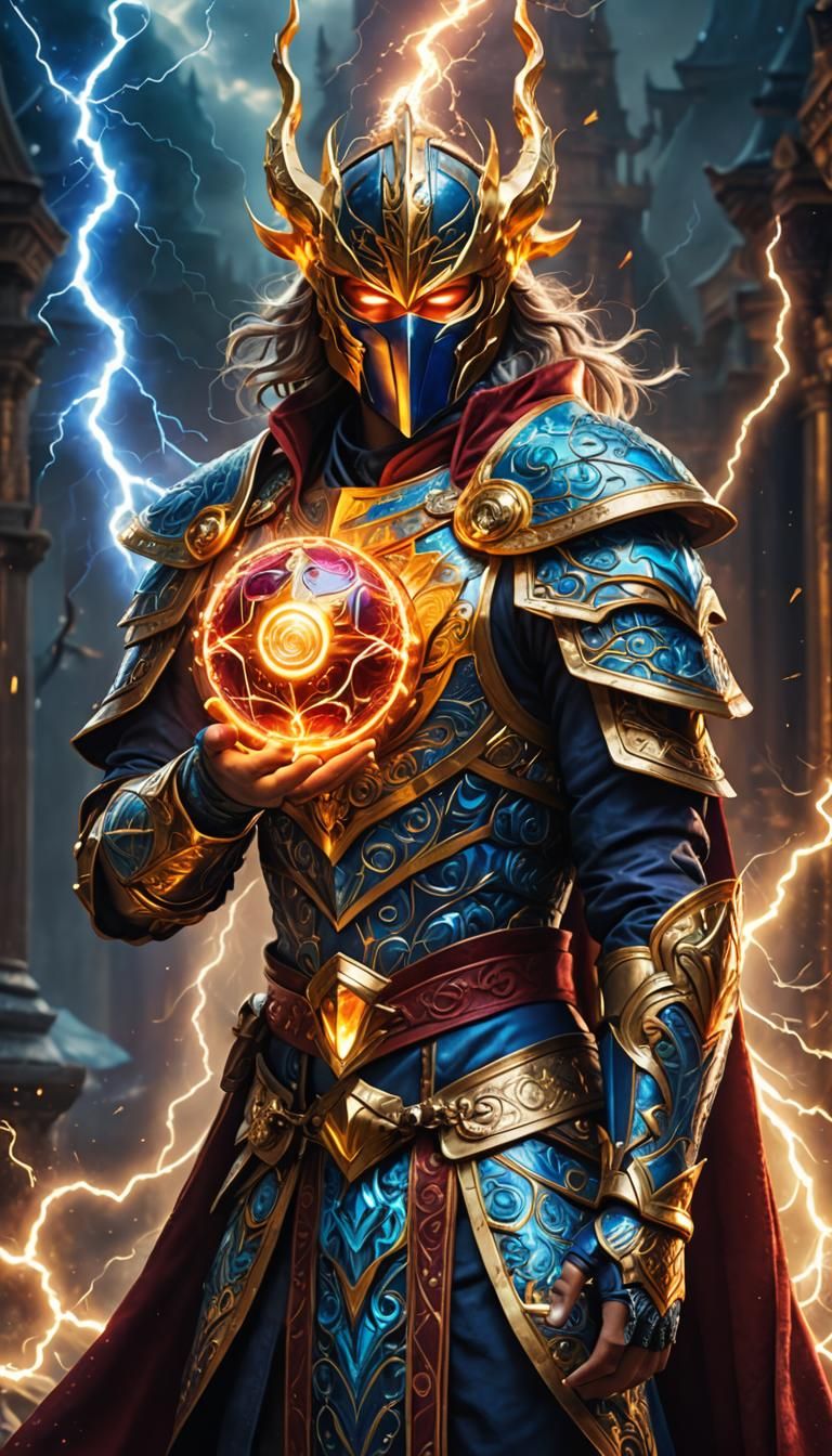 This image shows a battle mage with a mask holding a ball of lightning. The background features vibrant colors, intricate armor details, and a shimmering, cinematic aesthetic in 8K 3D HDR.
