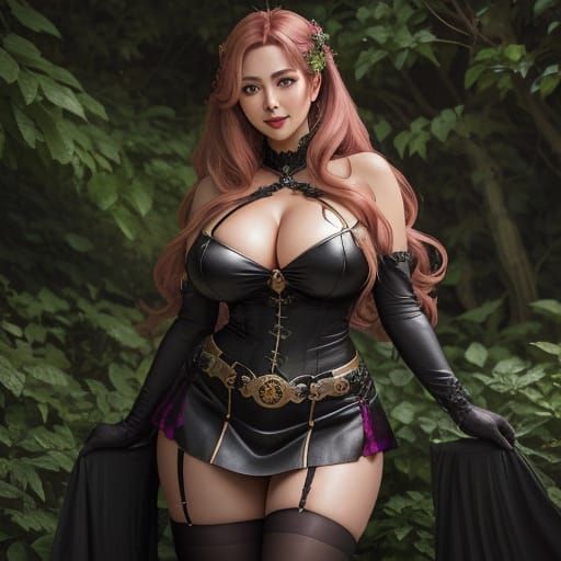 This image depicts a stunning, curvy agejo gyaru witch anime character, blending pulp horror and vintage sci-fi elements with Art Nouveau flair. She wears a intricate, industrial design-inspired outfit adorned with cables, pipes, and machine parts, amidst lush greenery and vibrant flowers, all set agains...