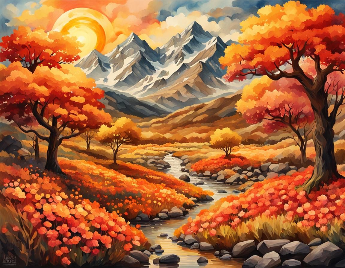 A vivid painting of a mountain creek with orange flowers and oak trees. The vibrant, rustic color palette and intricate details create a hyper-detailed landscape under a bright yellow sun. Rendered as abstract art.