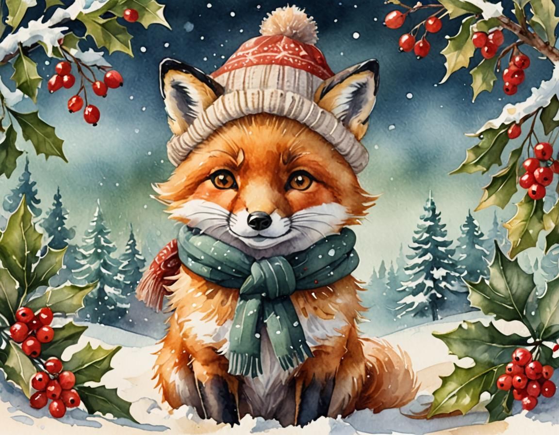 A charming watercolor image of a fox in winter attire amidst a snowy scene with holly. The artwork evokes a vintage holiday postcard with its soft textures and warm, golden light.
