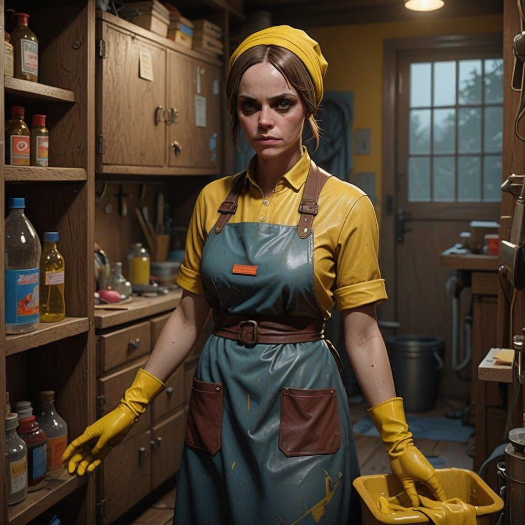 A worn and weary woman, dressed in a worn-out dress and rubberized headscarf, stands amidst the mundane tasks of a cleaning closet, surrounded by the tools of her labor.