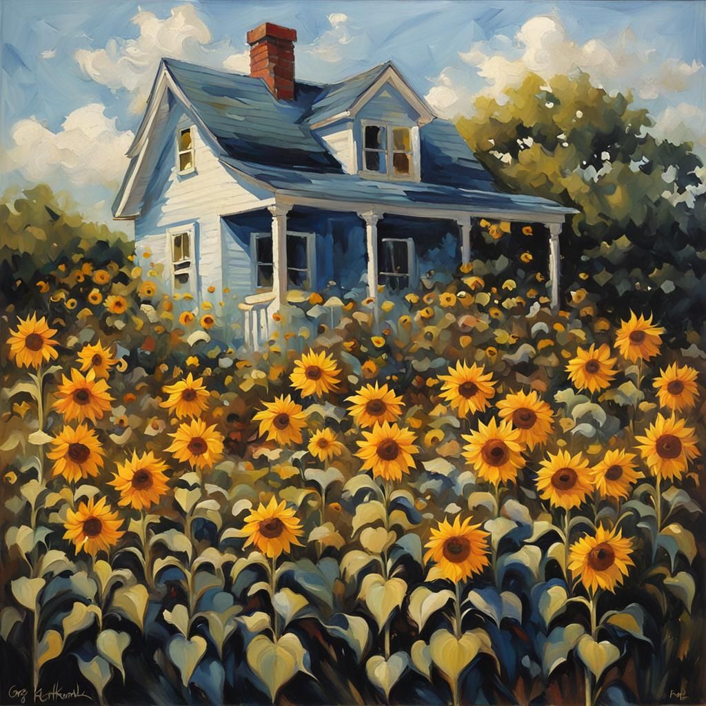 A striking picture of sunflowers growing in a beach cottage garden. The image has a sinister aesthetic.