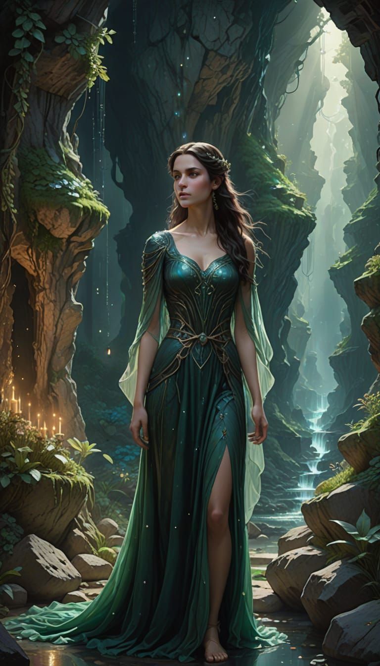 This image shows a beautiful, statuesque woman with raven hair and emerald eyes in a crystal cave. The photorealistic image features professional lighting and an ethereal, fantasy aesthetic.