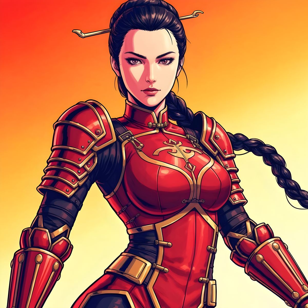 This image shows a female commander wearing an armored qipao in red and gold. The character, a Chinese woman, features long braided hair and a hairpin, rendered as cel-shaded anime art.