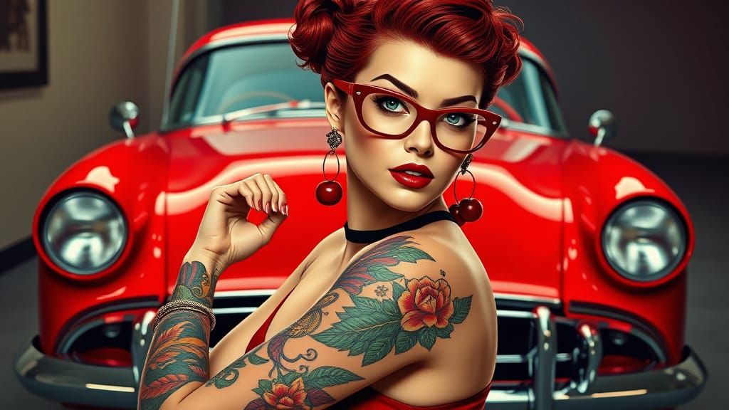 This striking image features a sultry rockabilly woman with colorful arm tattoos, retro glasses, and bold earrings, posing confidently in front of a sleek, cherry-red classic coupe, blending futuristic and nostalgic elements with dramatic lighting and bold colors.