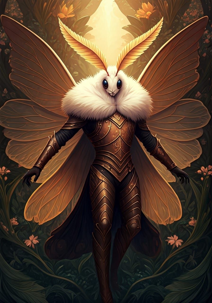 A vibrant digital illustration of a moth-like insectoid in ornate armor, posed heroically in a floral landscape. The artwork features intricate linework, iridescent colors and a high-contrast palette, as fantasy manga art.