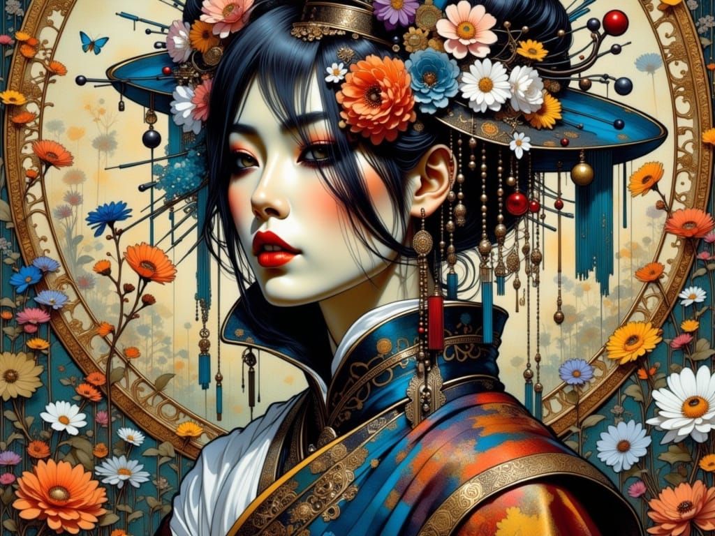 This image features an Irish shogun in futuristic spatial suits, surrounded by cats inside a cabin. The artwork uses bold lines, bright colors, and distinctive facial features for an expressive look.