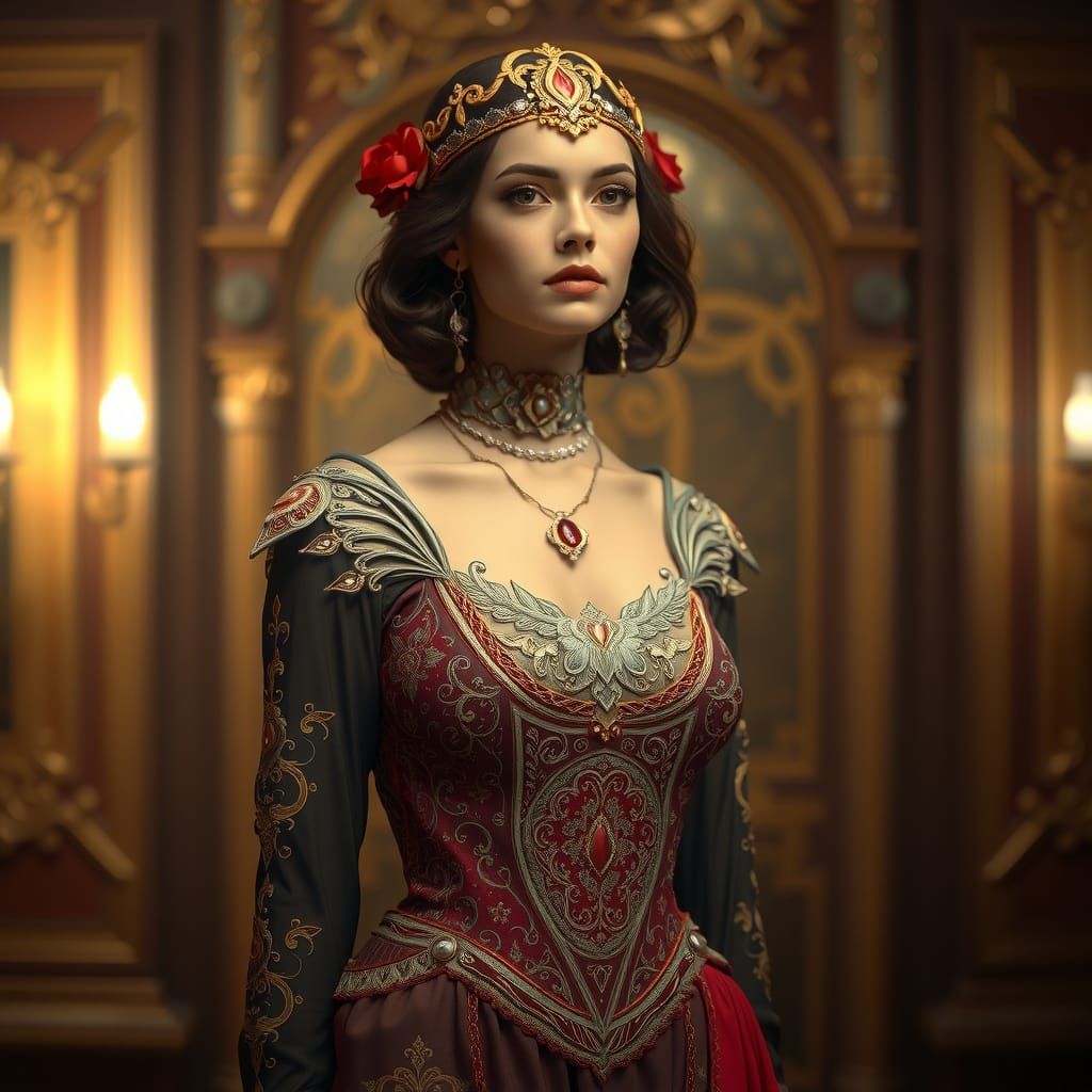 This image shows a woman in elegant attire, standing alone. The shot features intricate details, cinematic lighting, and a 35mm film aesthetic, blending Art Nouveau with futuristic elements.