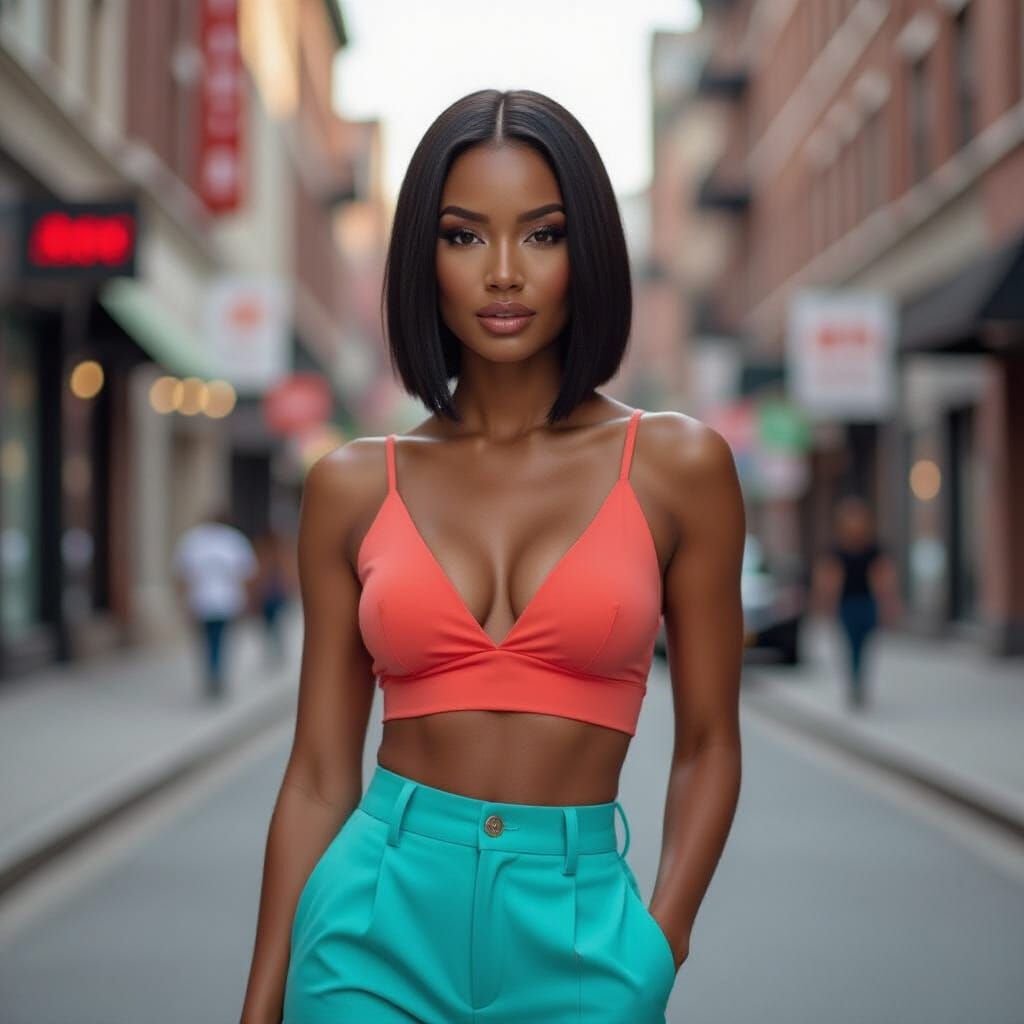 A fashion-forward image of a Black woman in a coral crop top and turquoise pants, posing in a city. Features cinematic lighting and a 35mm film aesthetic.