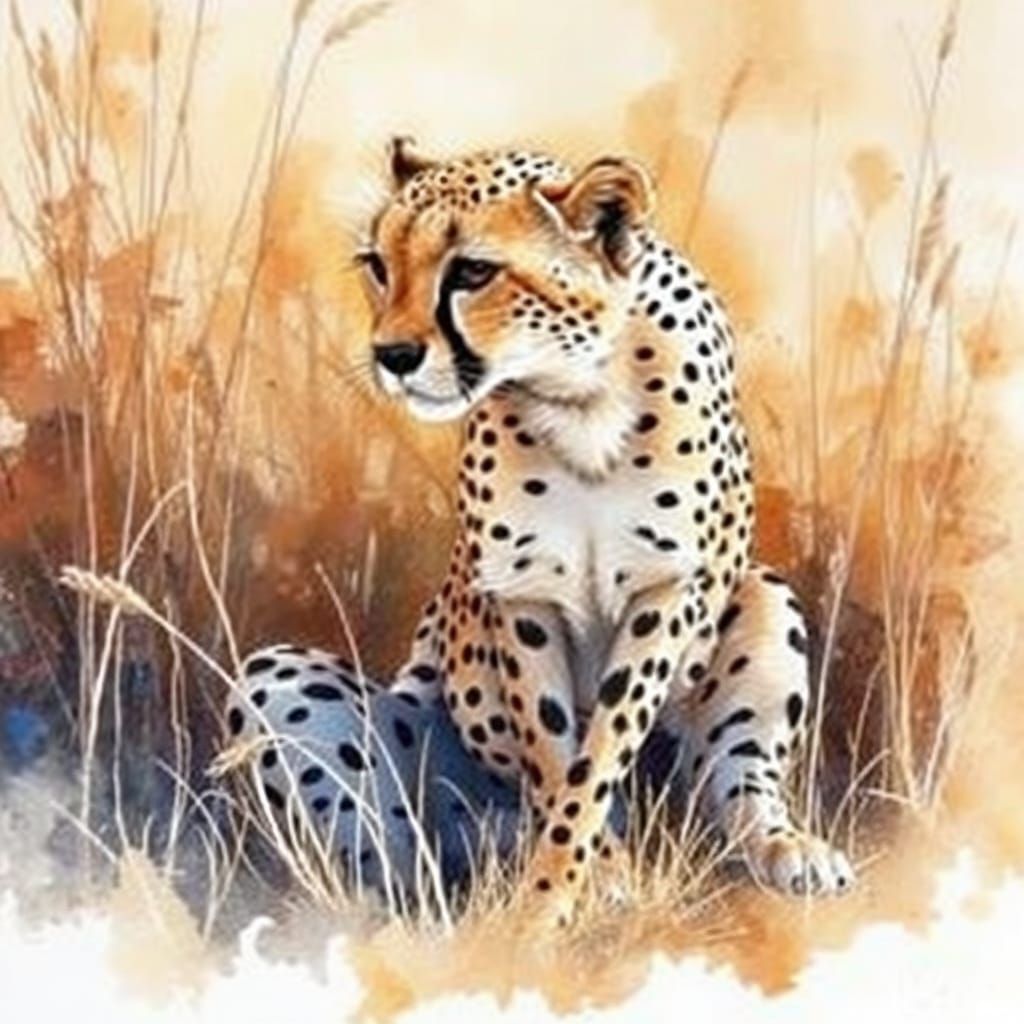 This image shows a cheetah resting in dry, golden grass. The scene is rendered in a soft watercolour style, evoking a sense of calm and natural beauty.