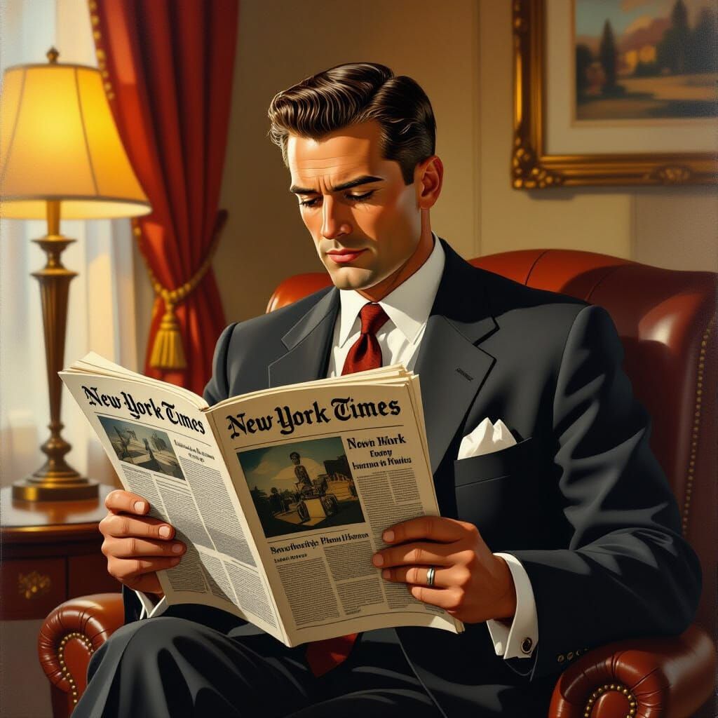 A detailed oil painting of a man reading a newspaper in a classic interior setting. The artwork features warm lighting and realistic textures in the style of golden age illustration.