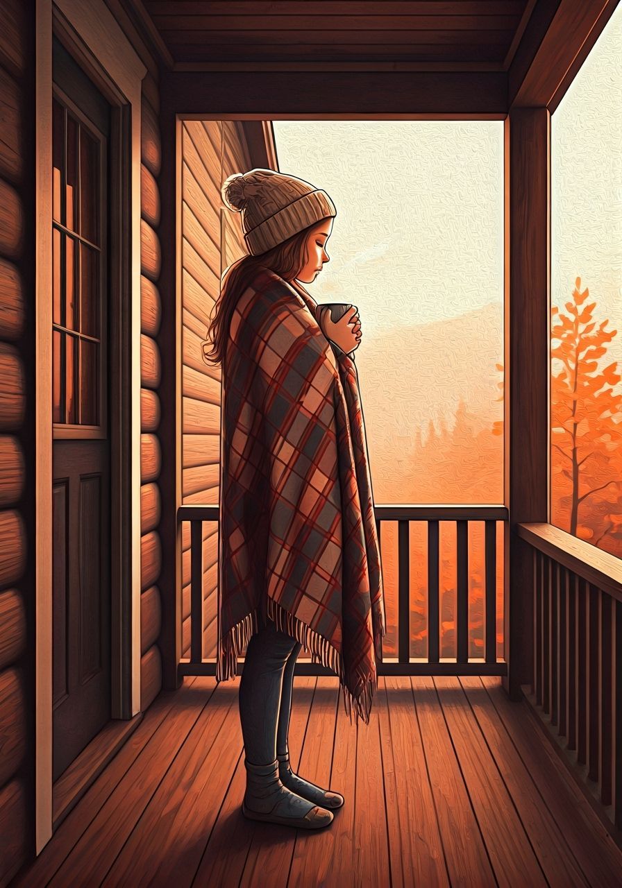 Generate your own warm autumn morning images with a girl, blanket, and coffee. Free and easy AI art creation.