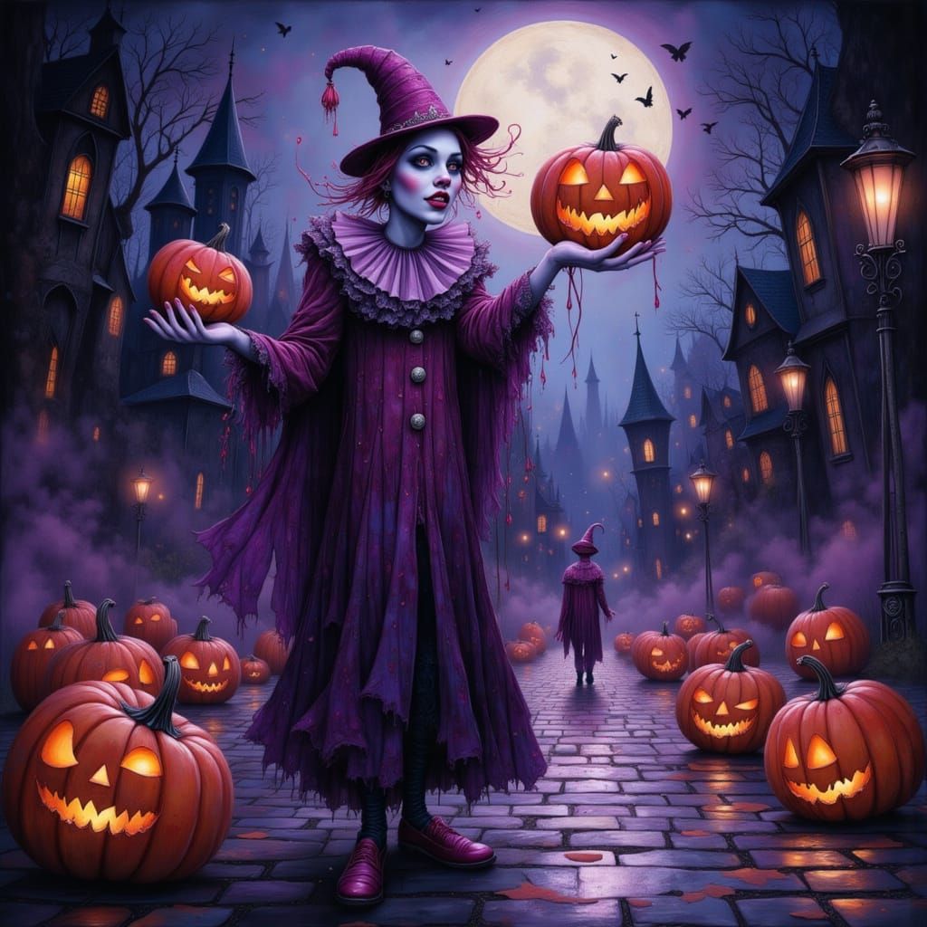 This image shows a sinister spectral clown juggling candy-corn pumpkins on a foggy street, rendered in a dark, gothic illustration style with sharp lines and vivid pops of color.