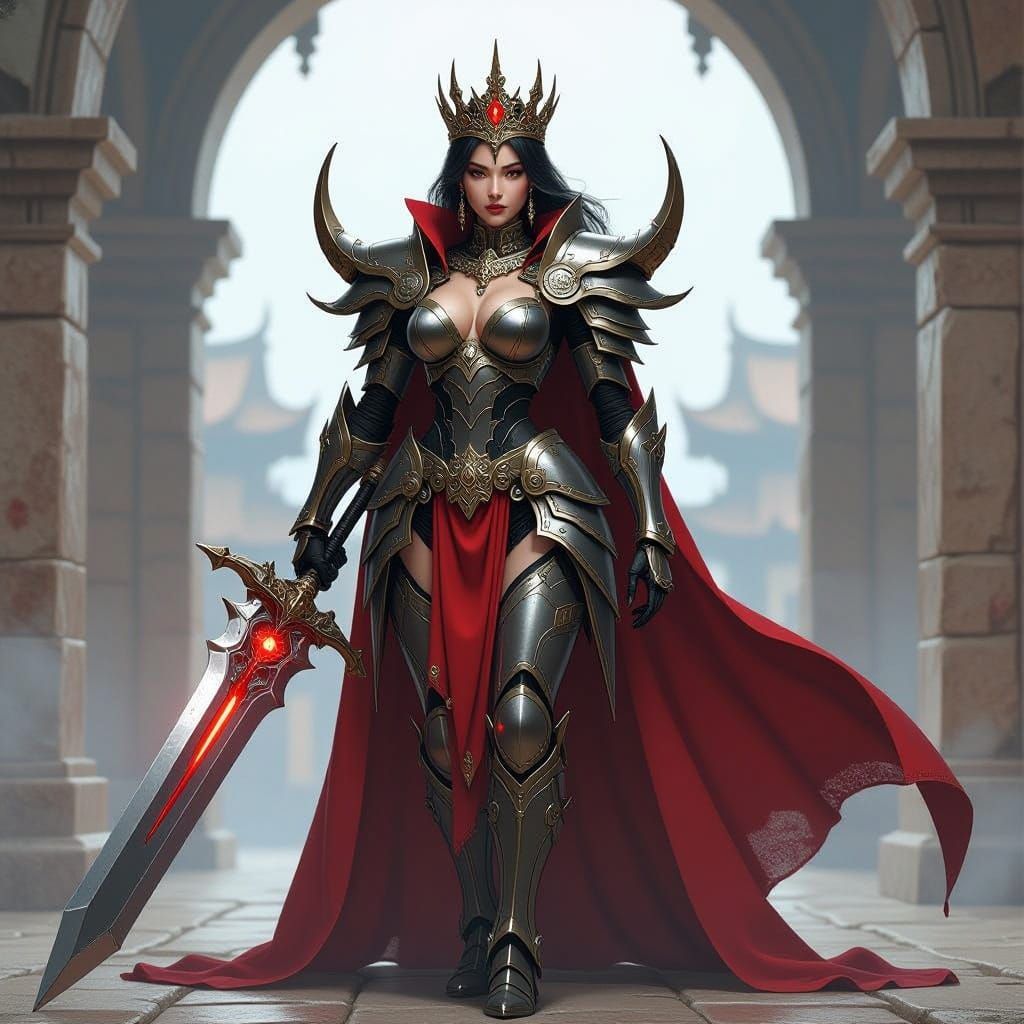 A striking picture of a cyborg demon queen in ornate armor holding a large sword. The image features dark fantasy elements with mechanical details and dynamic lighting.