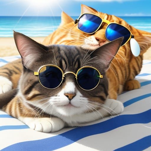 Generate your own happy, sunbathing cats with sunglasses on a beach, easily and for free!