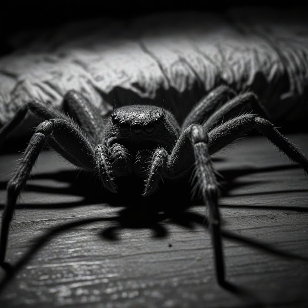 A close-up, black and white image of a gigantic, infected spider crawling out from under a bed, illuminated by dark shadows and glowing eyes, creating a creepy atmosphere reminiscent of dark academia and bio horror