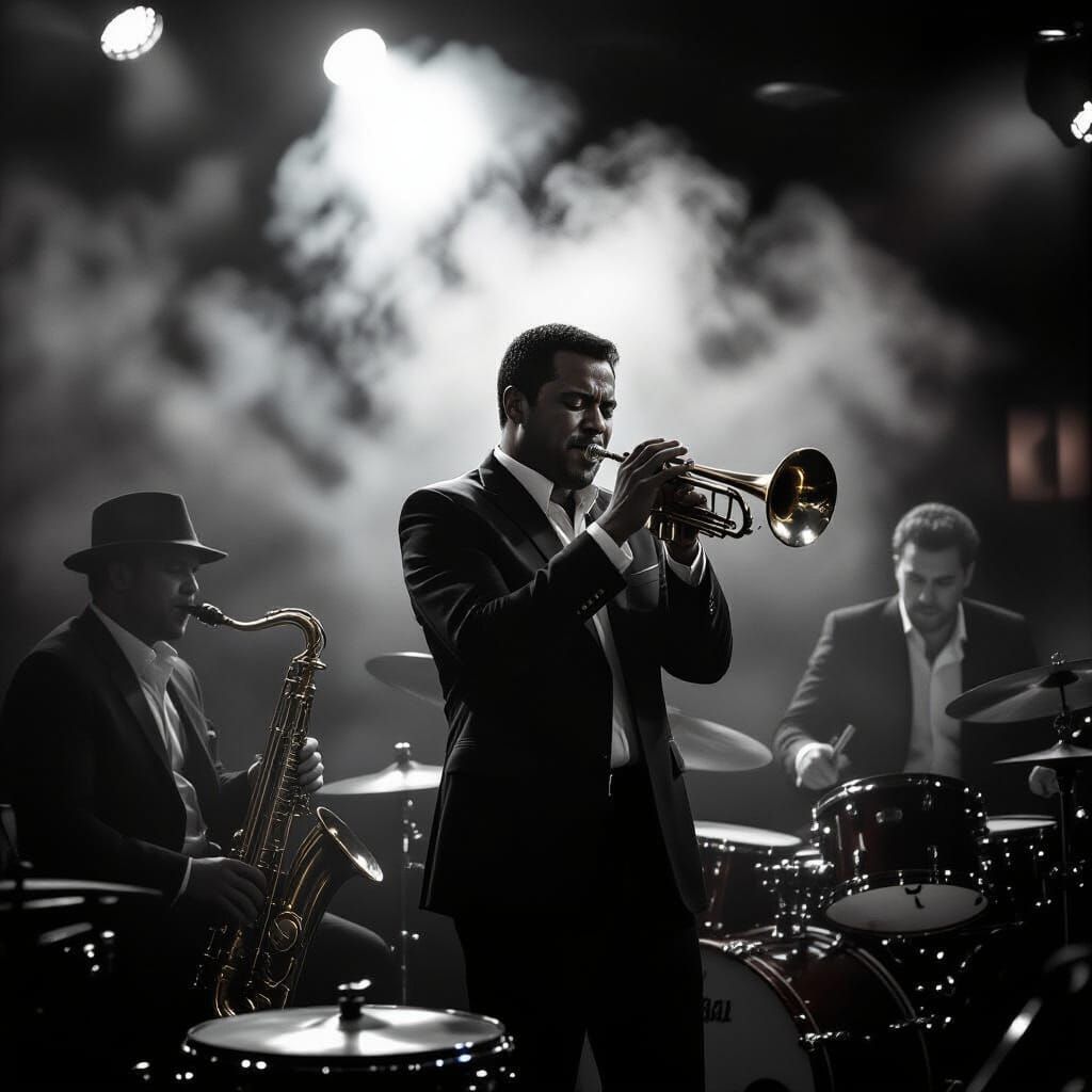 This image shows a jazz band performing in a smoky club with cinematic lighting. The black and white photograph captures the raw emotion of the performance with gritty, noir undertones.