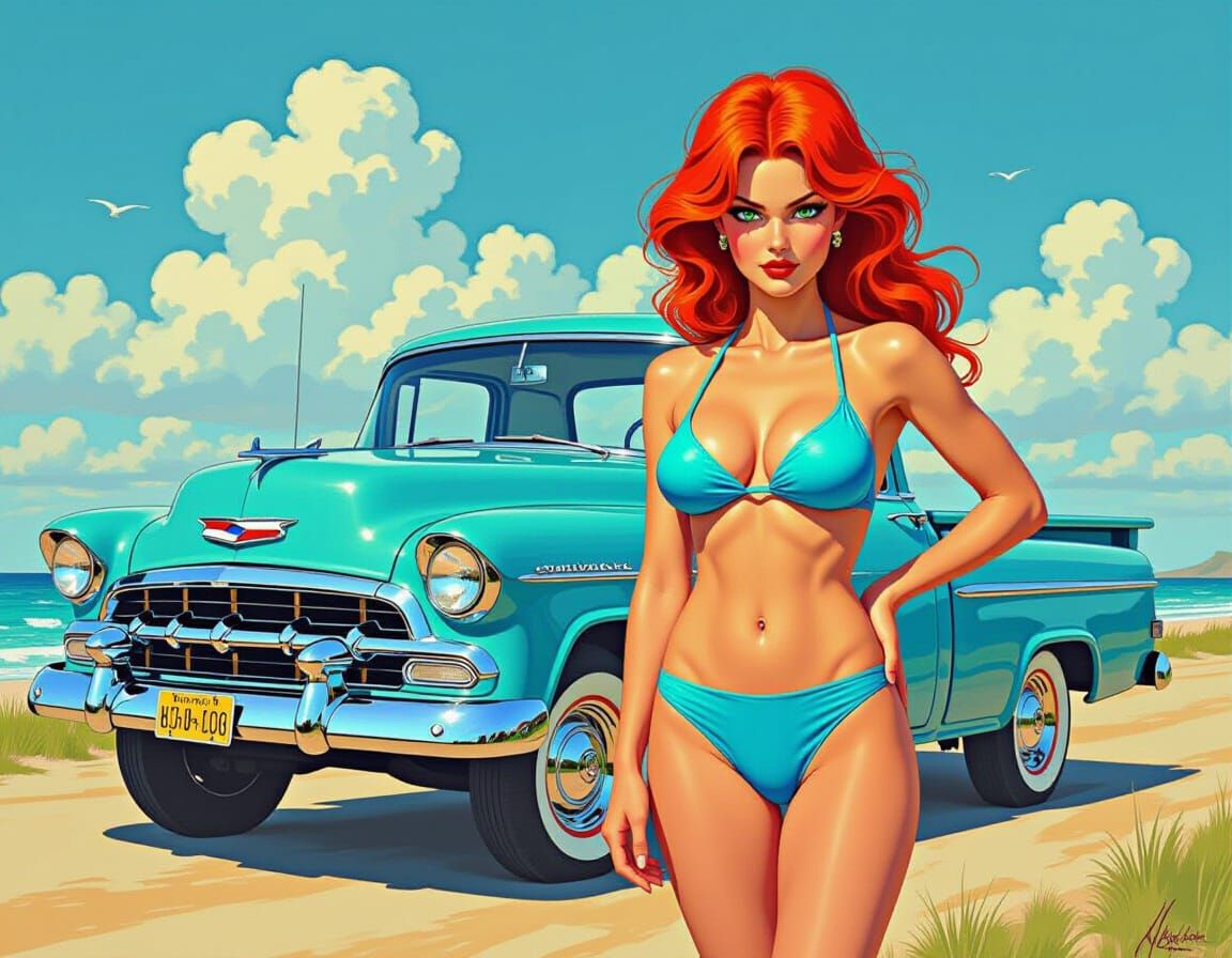 A vibrant image of a woman with fiery red hair in a blue bikini, standing next to a vintage blue pickup truck. The image has bold shading and textures, with expressive brushstrokes.