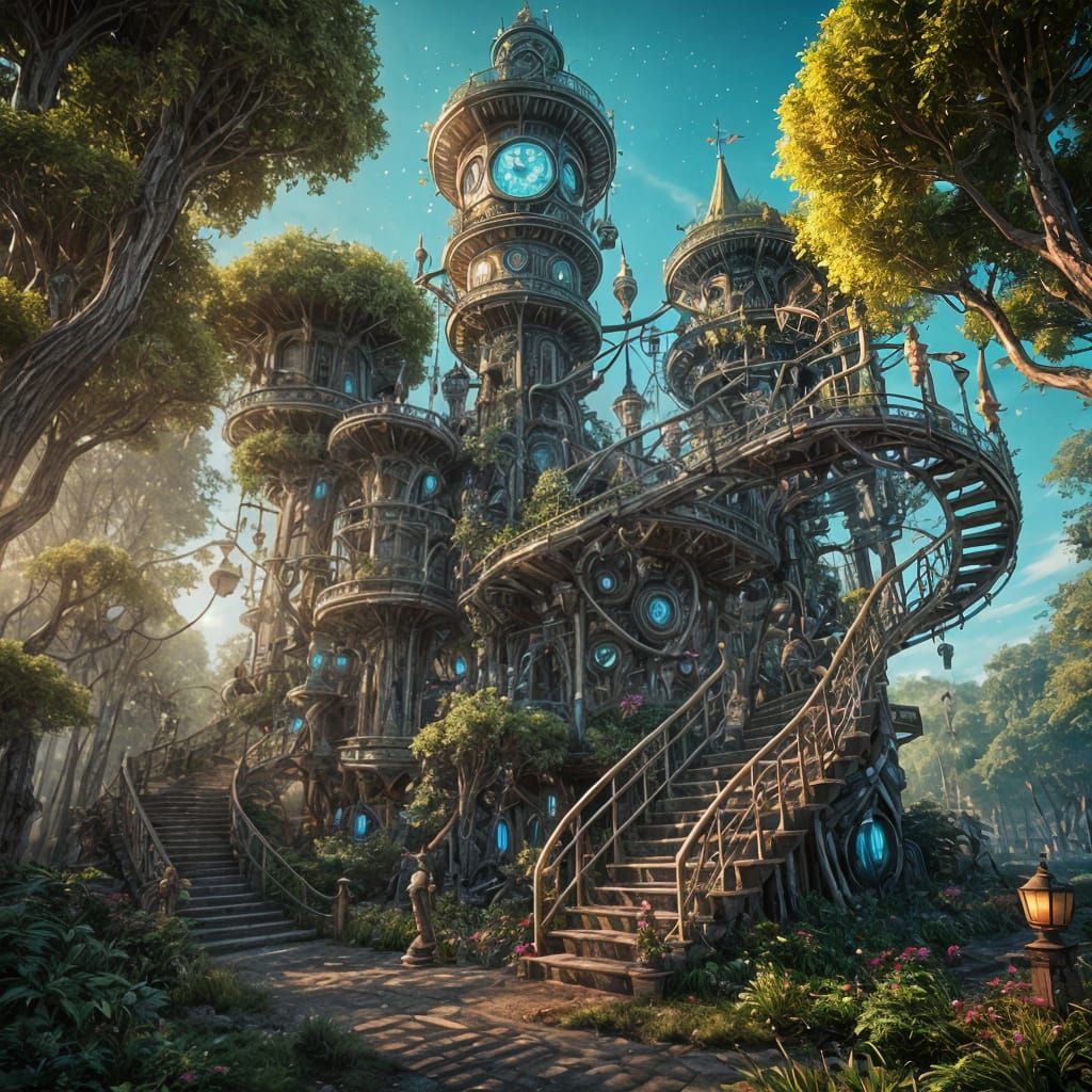 This image depicts a mechanical clock tower within a fantastical, enchanted forest. It features dreamlike, complementary gradients and sparkling colors, rendered with a refined HD look.