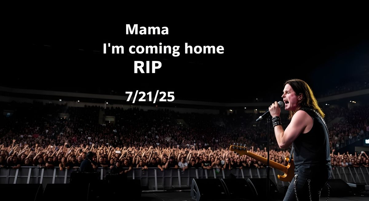 This image shows Ozzy Osbourne performing live on stage. A packed arena of fans is visible in the background, with a memorial caption rendered in white lettering.
