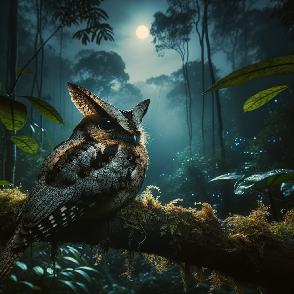 This image shows a great eared nightjar perched on a branch at night. The scene depicts a tropical forest in Southeast Asia, with glowing bioluminescent organisms and moonlight illuminating the nightjar as it watches for prey.