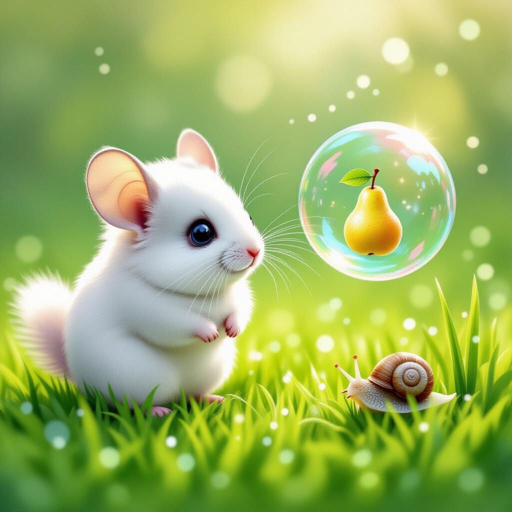 This image shows an adorable white chinchilla with blue eyes on shimmering grass, looking at a magical pear inside a bubble. Rendered in a whimsical storybook style with soft lighting.
