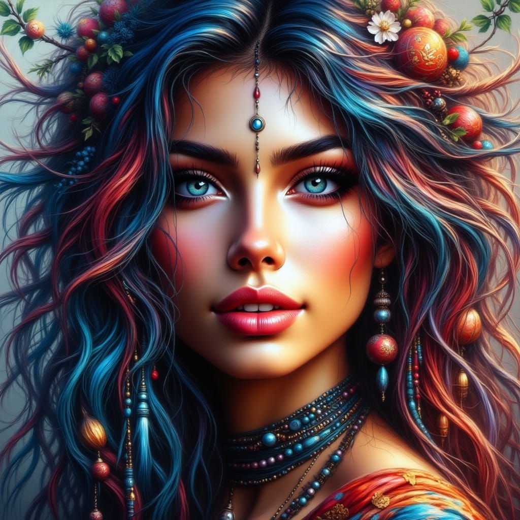 This image showcases a hyperrealistic portrait of a woman adorned in detailed, colorful clothing and futuristic jewelry. Rendered in a matte painting style, it features dramatic lighting and complementary colors for a sense of depth and wonder.