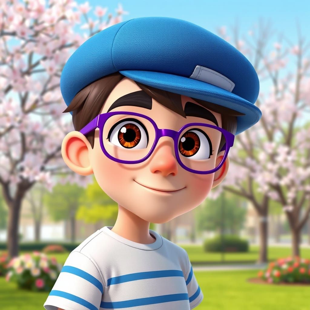 This animated image captures a vibrant spring scene in a park, featuring a young man with a blue hat, purple glasses, and a blue-striped shirt, set against a colorful backdrop of blooming flowers and lush greenery.