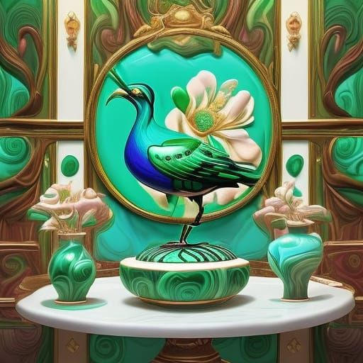 A regal peacock centerpiece anchors this ornate tabletop arrangement, surrounded by delicate floral accents in matching vases. Set within a richly textured green-and-gold interior, the scene evokes vintage luxury and serene contemplation. Decorative flourishes—including a large floral-framed backdrop—bring balance to the composition, blending symmetry and softness.