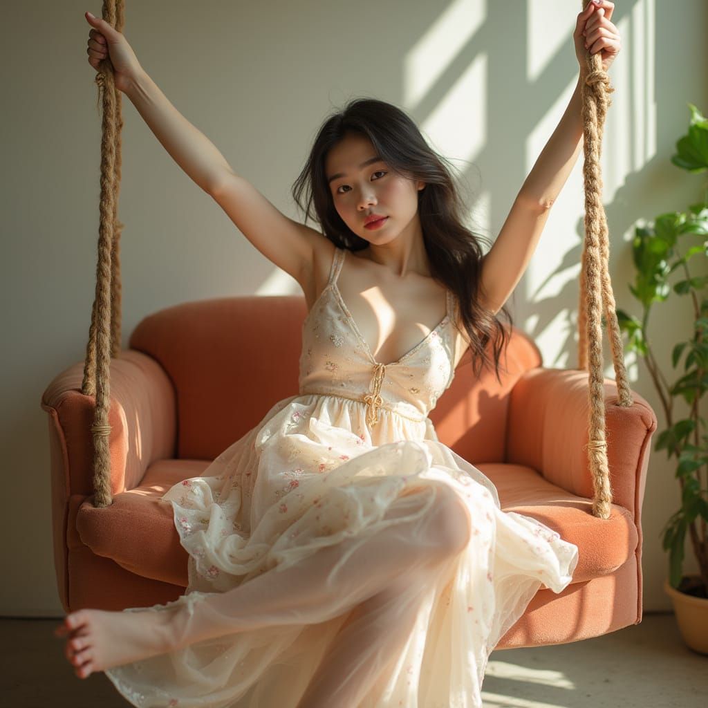 A photorealistic image of a Korean woman sitting on a velvet swing in a sunny studio. She is wearing a sundress with floral patterns in this dreamy, artistic rendering.