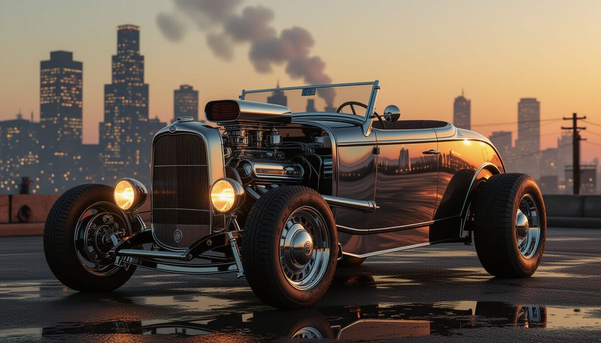 A hyperdetailed dieselpunk Ford-T with chrome and riveted metal, set in a smoggy industrial city at dusk. Features cinematic lighting and a retro-futuristic aesthetic.