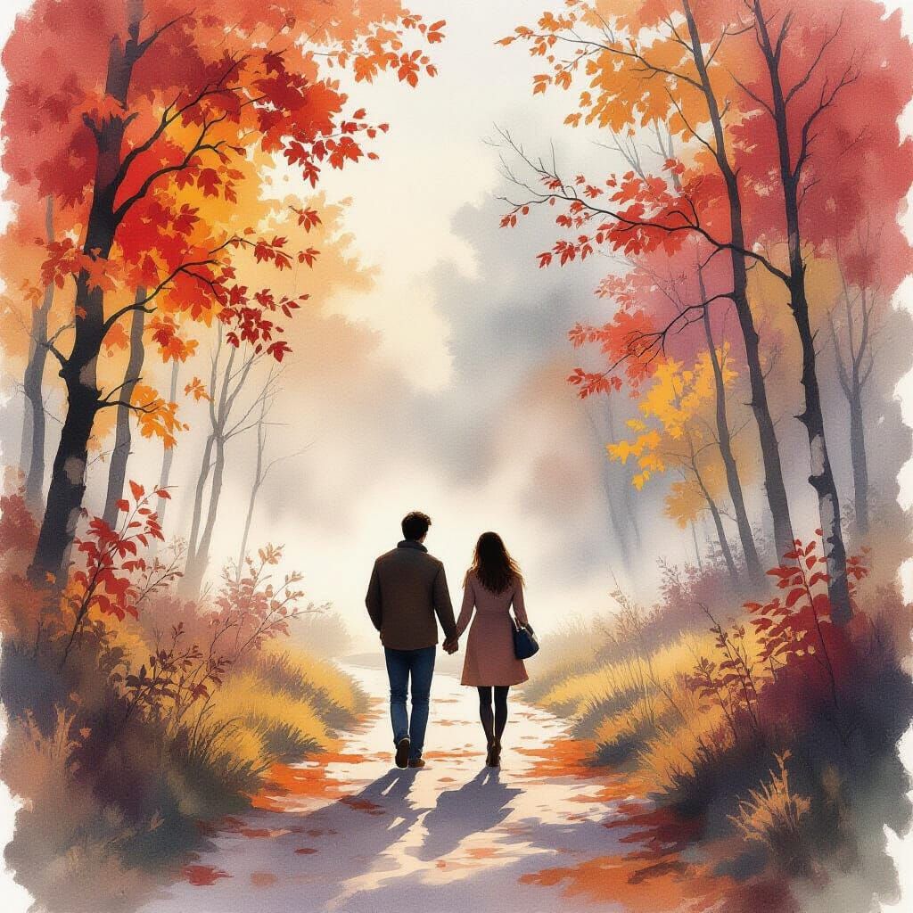 A romantic watercolor painting of a couple walking hand-in-hand through a mystical, foggy autumn forest. Soft colors and flowing brushstrokes evoke a dreamlike, gentle atmosphere.