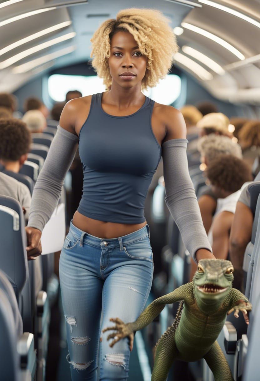 This image shows a fit Black woman with an afro in casual clothing battling a lizard creature on an airplane. The image is high-resolution and features dynamic lighting.