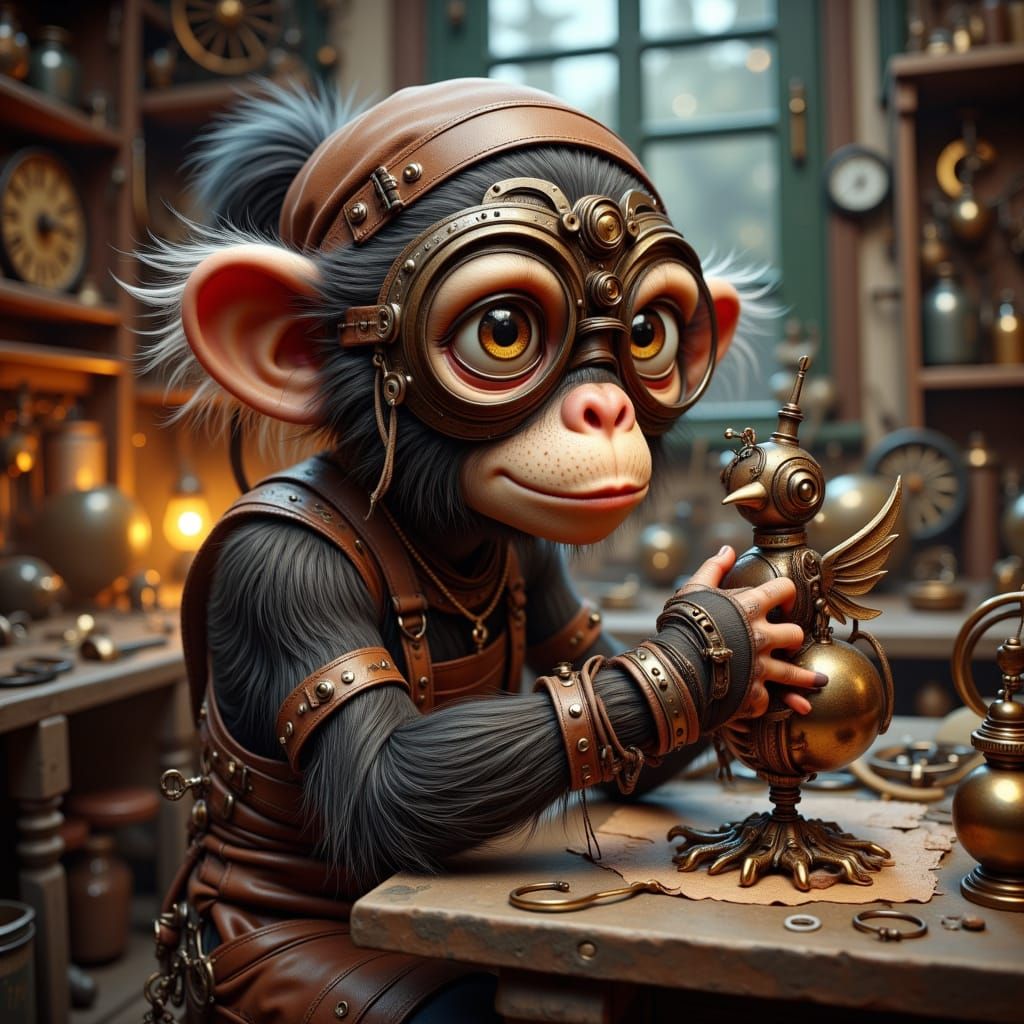 <lora:Bohemian Whimsy:1.0> Steampunk portrait. A chimpanzee mechanic wearing goggles and a leather apron, carefully calibrates a tiny brass clockwork bird. The workshop is cluttered with tools and half-finished inventions. Shot on medium format film. Intricate clockwork details. Warm, inviting lighting. ...