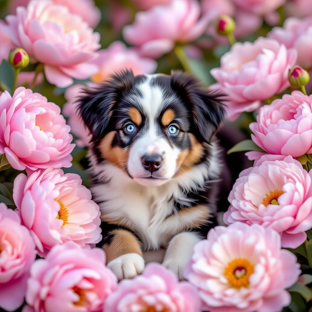 A young Australian Shepherd puppy with tri-color markings of white, black, and tan lies among a luxurious arrangement of pink peonies. The puppy displays heterochromatic eyes - one bright blue and one amber-brown - and has a fluffy, soft coat. The puppy's head is turned toward the camera with eyes gazing ...