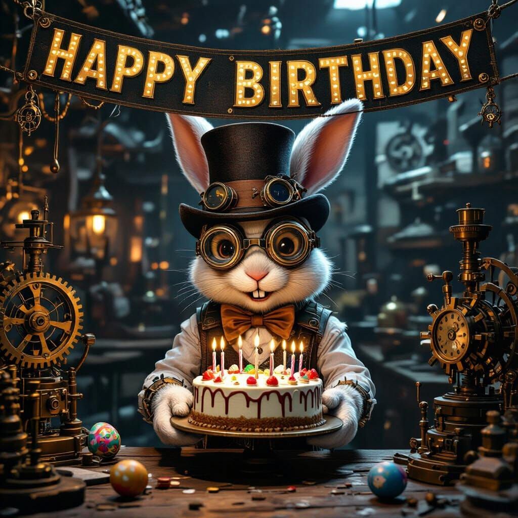 This image shows a steampunk Easter bunny in a dimly lit workshop, complete with goggles, top hat, and birthday cake. The scene is filled with clockwork machines and industrial sci-fi elements.