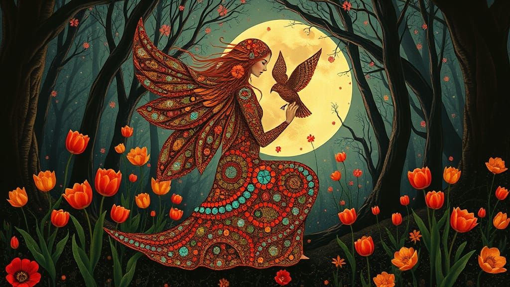 A vibrant image of a psychedelic utopia filled with sacred geometry and bizarre creatures. This maximalist artwork evokes a whimsical, dreamlike quality reminiscent of art nouveau.