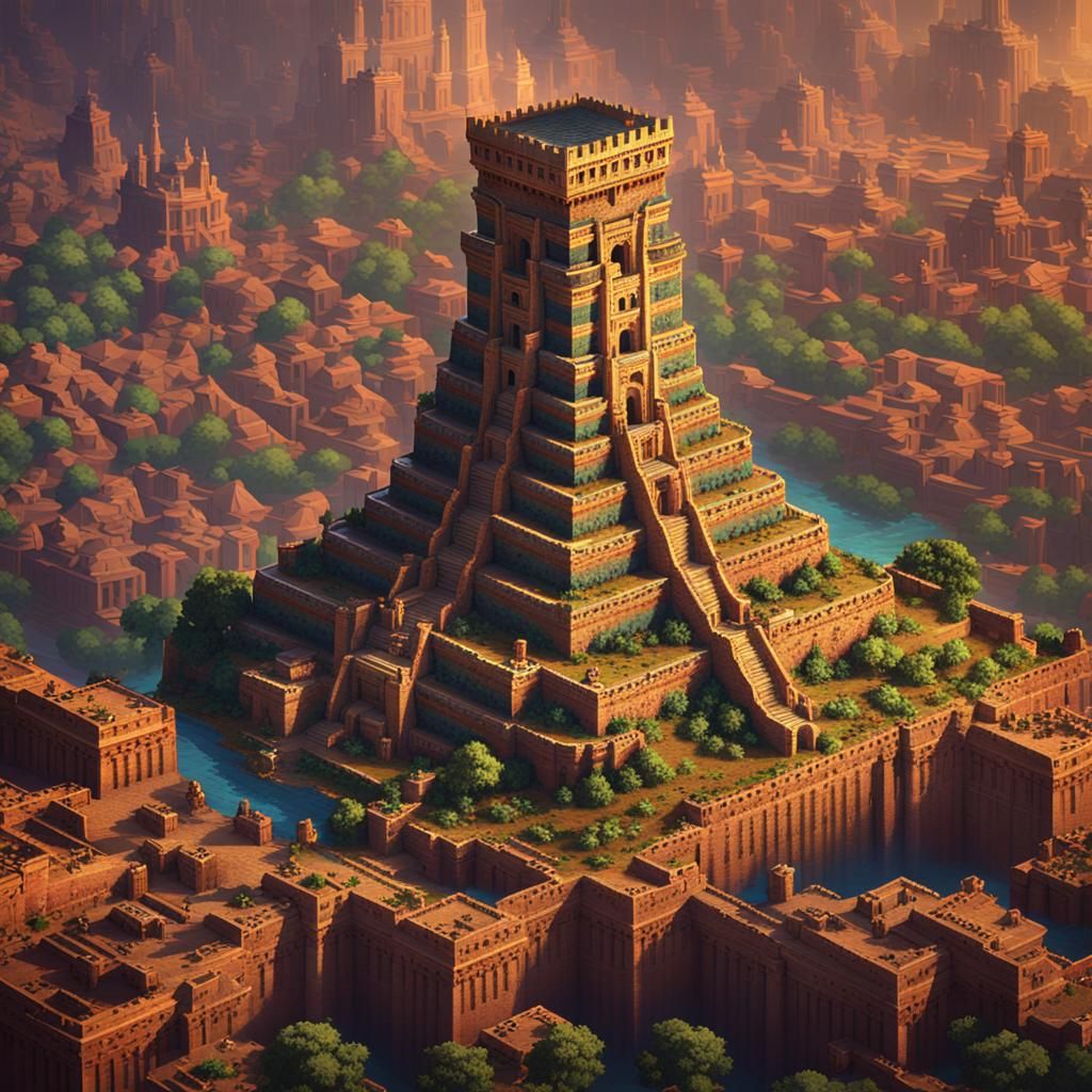 This image shows a pixelated depiction of the Tower of Babel. The artwork features rich colors and intricate details in a fantasy style, reminiscent of concept art.
