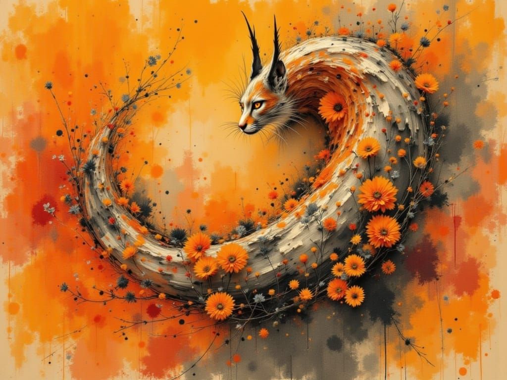 This image shows a desolate, charcoal-toned landscape with blooming orange petals amidst a scene of devastation, where a mysterious, hungry observer watches over the ruins.