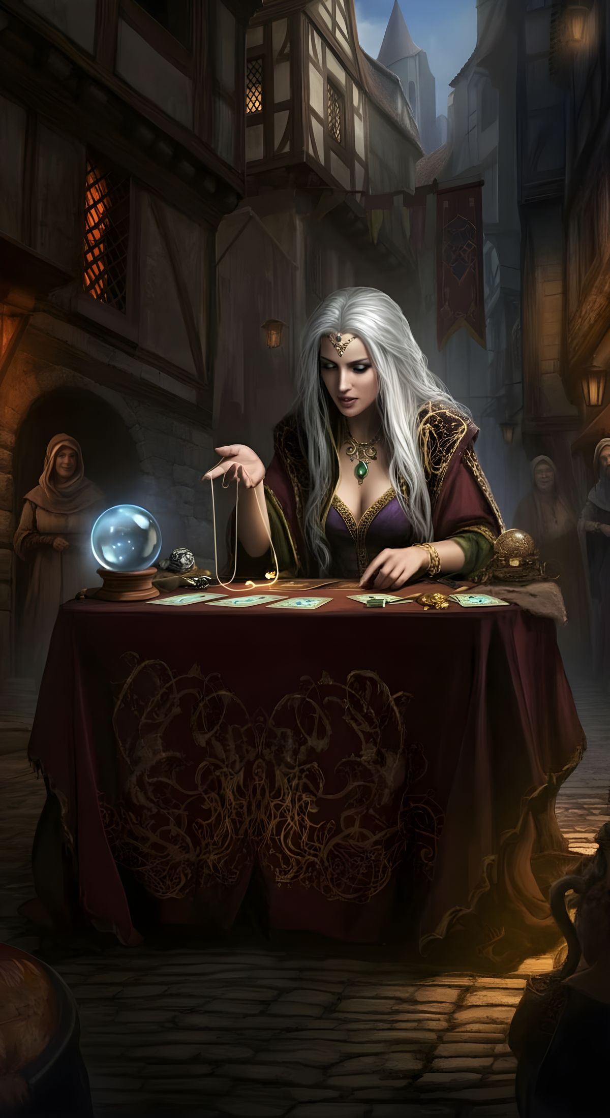 This image shows a fortune teller at a desk in a busy medieval city street. The artwork features intricate details, deep colors, 3D shading and a fantastical aesthetic.