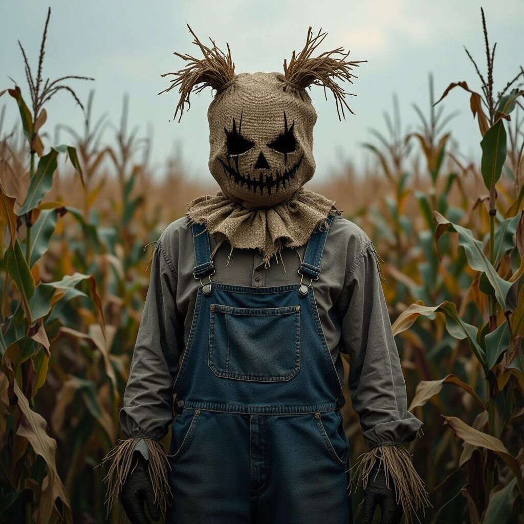 A terrifying scarecrow with a burlap sack head stands in a cornfield. This image evokes a dark, gothic horror aesthetic with muted colors and dramatic lighting.